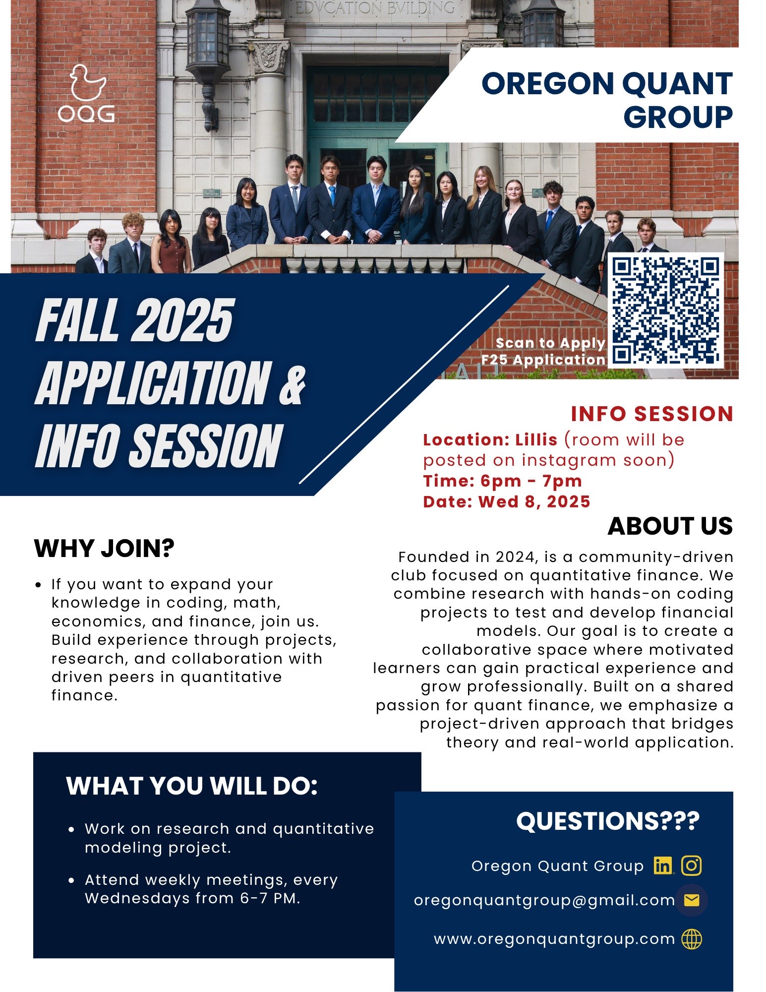 The Oregon Quant Group fosters a collaborative environment in which students can work on research projects in quantitative finance. These projects intend to expose students to the intersection between mathematics and finance. By exploring various asset classes such as Equities, Commodities, Bonds, etc, we simulate hedge fund environments to help students learn and grow.